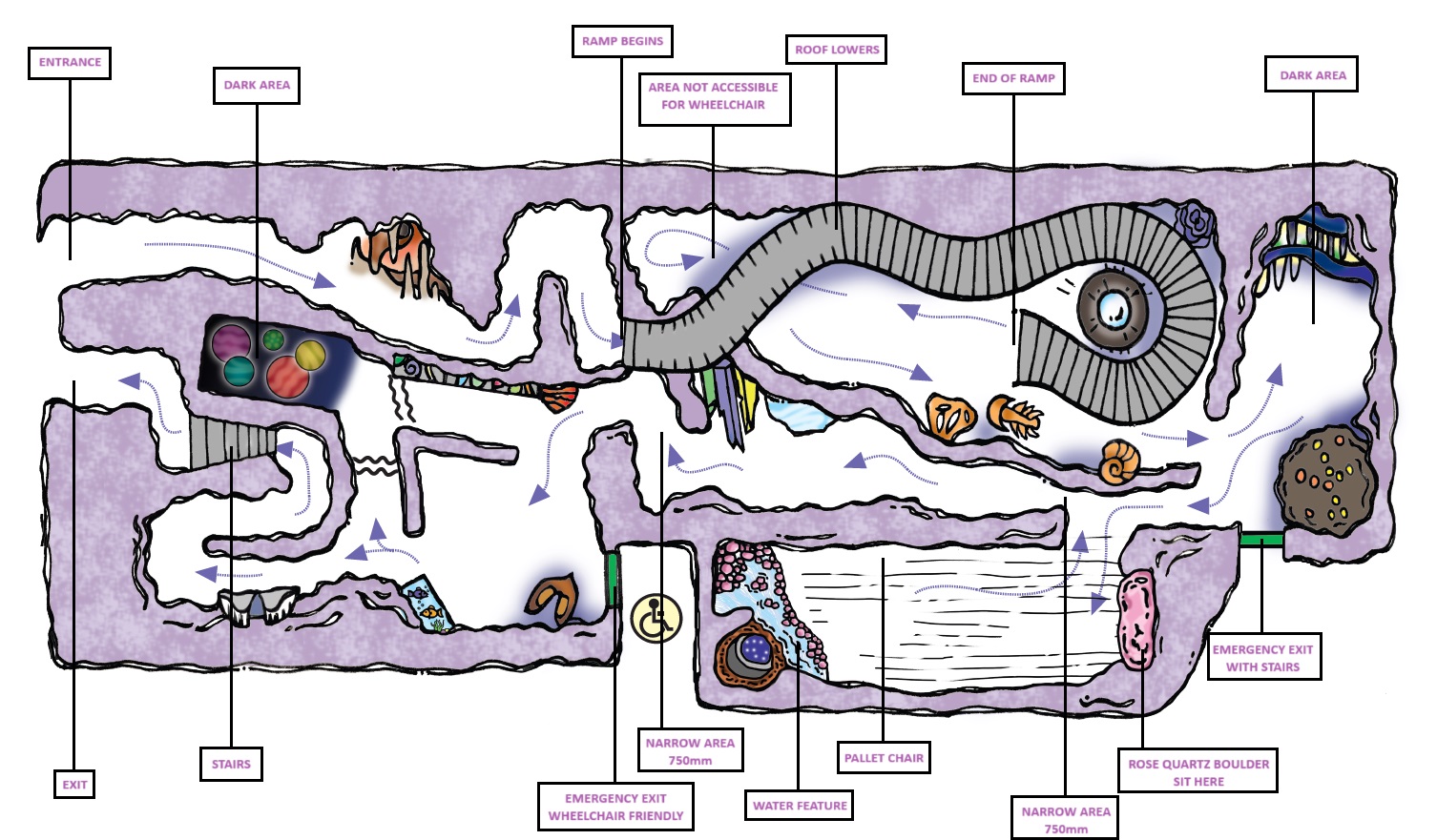Winding walkway – just like a real cave, the walkway has a low ceiling at the beginning. Here, delicate specimens are positioned just out of reach on either side of the ramp.
